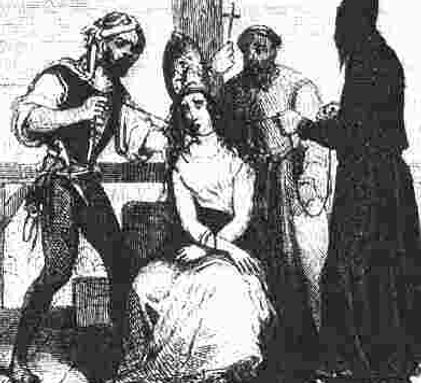 El inquisidor (izquierda) interroga a un sospechoso bajo tortura. Uno de los métodos favoritos era atarle las manos a la víctima atrás para después ser colgado de una soga atada a las manos. Este método le arrancaba los brazos de los hombros lo cual causaba terrible agonía y lo deshabilitaba de por vida, aunque después fuera encontrado inocente.