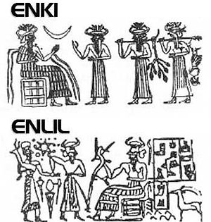 La historia relata: Aunque existía amor entre Enki y Enlil, ellos, a menudo no veían las cosas de la misma manera, sobre todo cuando se trató de apoyar a los seres humanos. Enlil nunca tenía paciencia o compasión para los humanos. La situación en el Jardín de Edén, Enlil estaba furioso que Enki les permitiera a los humanos tener acceso al conocimiento, a la mezcla de los genes Anunnaki con los genes humanos, poniéndose, por eso, mas "a la imagen de los dioses” e igual a los Anunnaki.
